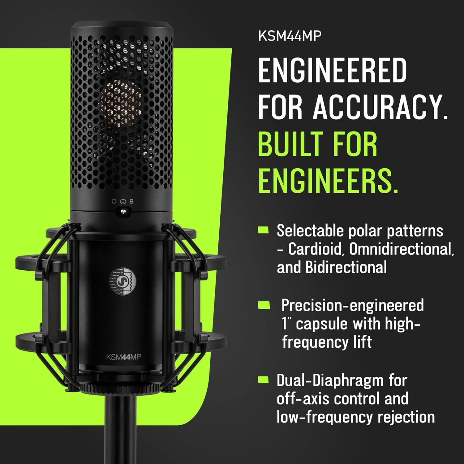 Shure KSM44MP Large Diaphragm Multi-Pattern Microphone - 1” Capsule, Selectable Patterns, Flat Response, Low Self-Noise, Includes Shock Mount & Pop Filter